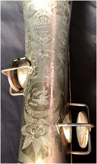 | Martin Handcraft, “Master Deluxe” #79395 (1927) Gold Plated! Early Handcraft model, these are rare as Martin mainly made altos before the Committee and then The Martin Series, very similar in lineage to the other Handcraft listed, but…this one is Gold Plated (original gold plate), largely clean with some wear, and with beautiful Art-Deco/”Portrait” engraving (with silver inlay) on the bell; most likely done by the same master engravers of the 1920’s that worked on the famous Conn “Portrait” saxophones-the work is that similar! (**Stenberg Bros. Conn Master Engravers). Gorgeous floral design in great detail and then…a pretty “Swan on the Lake”. This looks like it was repadded a long time ago, but the pads are worn and need to be replaced. Also, along the way, some one or another removed the key work and put a soldered in plug in the alternate Eb (famous to these early Martin’s and Conn’s of the day), that sits immediately above and to the left of the regular Eb tone hole. Free of dents and dings save for a Couple of small bumps on the bow, can be worked out easily. Matching serial number on the neckNot in the original case. Eminently collectible, still. Fair price on this vintage, highly collectible “Portrait” Martin Tenor. $1900 as is, $2400 with repad. |